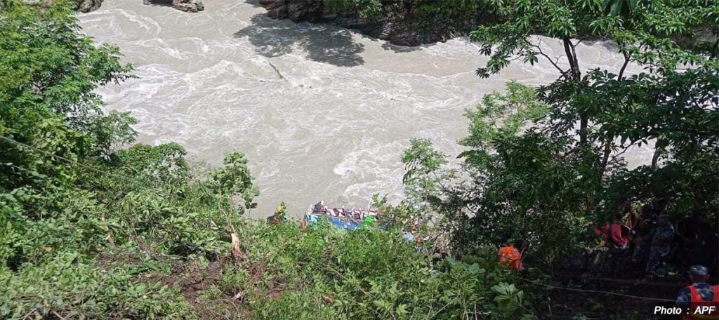 तनहुँ, ७ भदौ। तनहुँको आँबुखैरेनीस्थित ऐना पहरा नजिकै भएको बस दुर्घटनामा मृत्यु हुनेको सङ्ख्या २७ पुगेको छ। शुक्रबार पोखराबाट काठमाडौं आउँदै गरेको भारतीय पर्यटक सवार यूपी ५३ एफटी ७६२३ नम्बरको बस तनहुँको आँबुखैरेनी गाउँपालिका-२, ऐना पहरामा मर्स्याङ्दी नदी किनारमा खसेर दुर्घटना भएको हो ।
