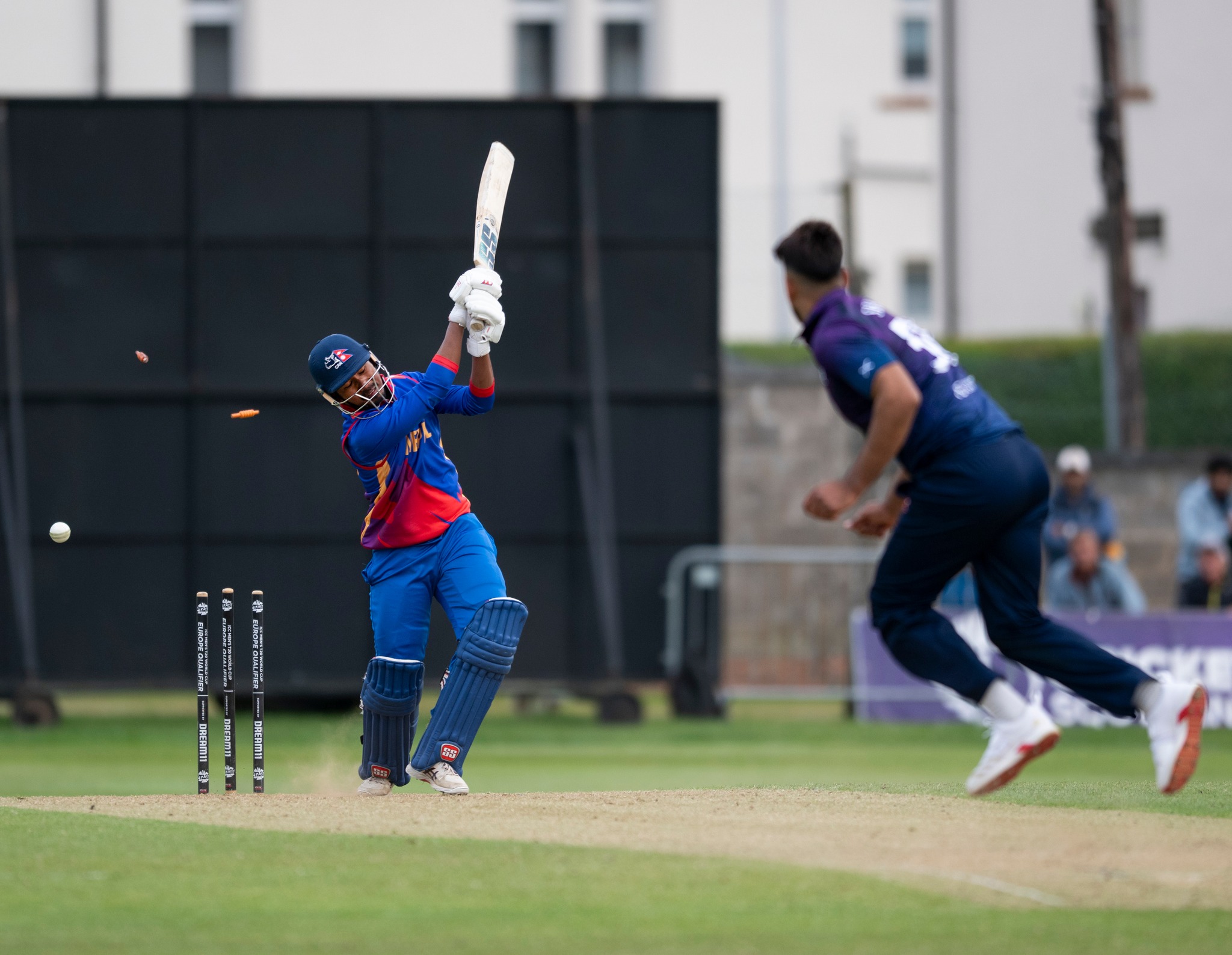 स्कटल्याण्डका लागि क्रिस ग्रीव्सले तीन विकेट लिए । सफायान सरिफले दुई विकेट लिँदा ब्रान्डन म्याकमुलेन, मार्क वाट, माइकल लीस्कले एक एक विकेट लिए ।