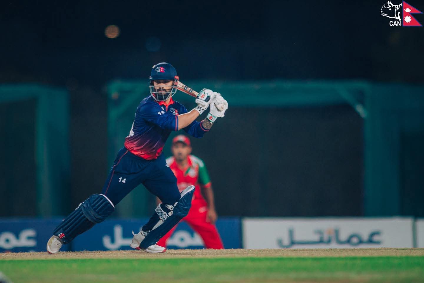 आदिल अन्सारीले १५ बलमा १६ रन र गुल्झन झाले १८ रन बनाए। आदिलले १५ बलमा ३ चौका र गुल्झनले १० बलमा २ छक्का प्रहार गरे। नन्दन यादवले ९ रन जोड्दा सोमपाल कामी १ रन र लोकेश बम शून्यमा आउट भए। बलिङमा ओमानका नदीम खानले ४ विकेट लिए।